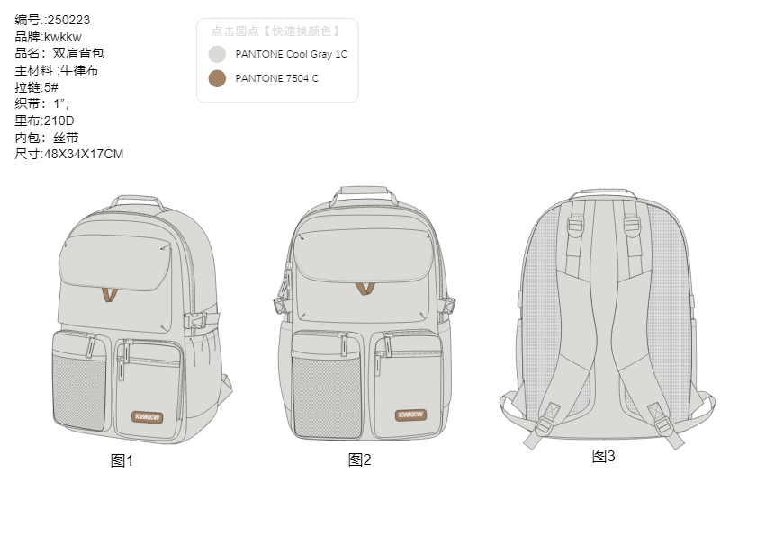 我将根据您的需求设计草图。包括前视图、后视图和侧视图,画好后发给你看一下确认,在进行下一步工作。 我们标准设计图,包含所有规格、内部视图、颜色和面料以及工艺信息等。 制作完成后,我们会打包源文件AI,PDF,jpg图稿给您,供版房制板及生产需要。