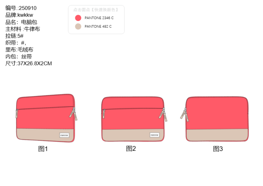 我将根据您的需求设计草图。包括前视图、后视图和侧视图,画好后发给你看一下确认,在进行下一步工作。 我们标准设计图,包含所有规格、内部视图、颜色和面料以及工艺信息等。 制作完成后,我们会打包源文件AI,PDF,jpg图稿给您,供版房制板及生产需要。