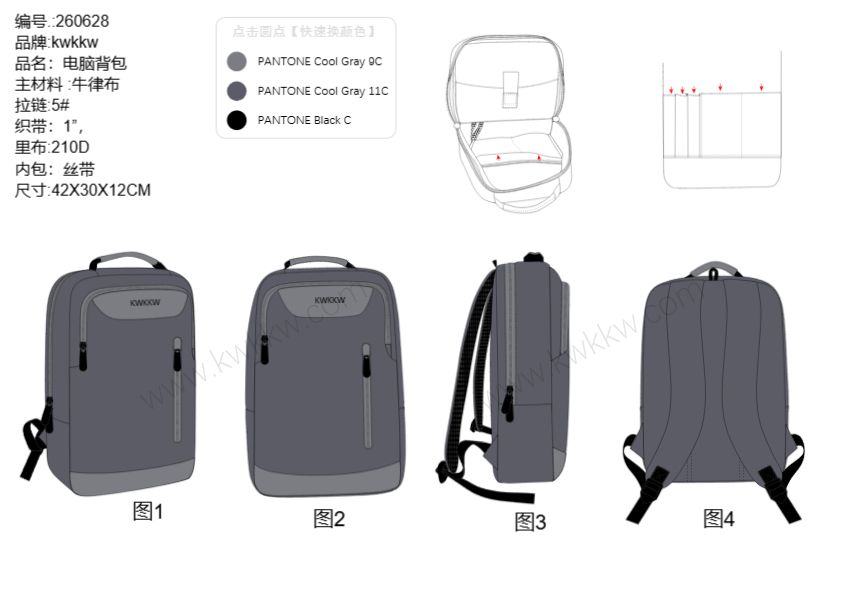 我将根据您的需求设计草图。包括前视图、后视图和侧视图,画好后发给你看一下确认,在进行下一步工作。 我们标准设计图,包含所有规格、内部视图、颜色和面料以及工艺信息等。 制作完成后,我们会打包源文件AI,PDF,jpg图稿给您,供版房制板及生产需要。
